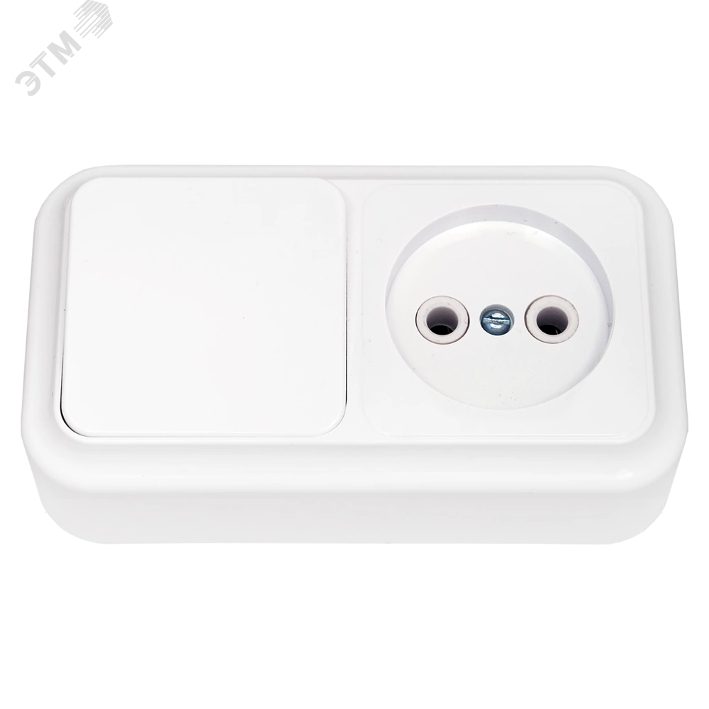 Блок состоит из выключателя одноклавишного и розетки открытой установки. Материал корпуса изготовлен из пластика АБС, обеспечивая прочность и долговечность изделия. Степень защиты блока – IP20, что обеспечивает защиту от пыли и посторонних предметов. Возможность горизонтальной и вертикальной установки.
