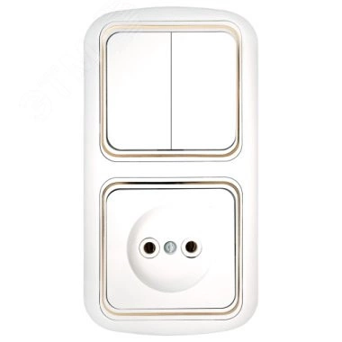 Блок состоит из выключателя двухклавишного и розетки скрытой установки. Возможность горизонтальной и вертикальной установки. В качестве материала для производства изделия использовался специальный очень прочный и экологически безопасный полимер. Изделие надёжно защищено от разрушительного воздействия ультрафиолетового излучения, не претерпевает видимых изменений при постоянных многочисленных эксплуатационных контактах.