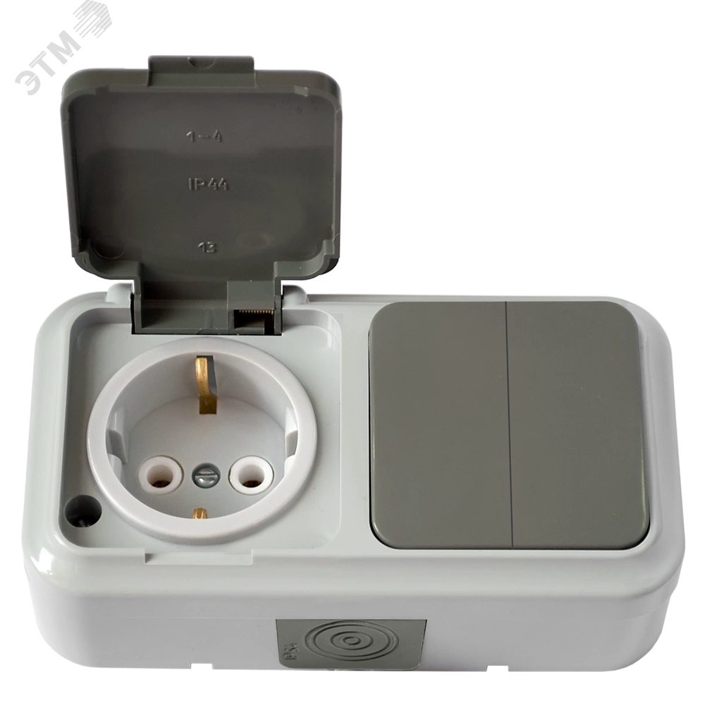 Блок состоит из выключателя двухклавишного и розетки с заземляющим контактом брызгозащищенный открытой установки. Материал корпуса изготовлен из пластика АБС, обеспечивая прочность и долговечность изделия. Степень защиты блока – IP20, что обеспечивает защиту от пыли и посторонних предметов. Возможность горизонтальной и вертикальной установки.