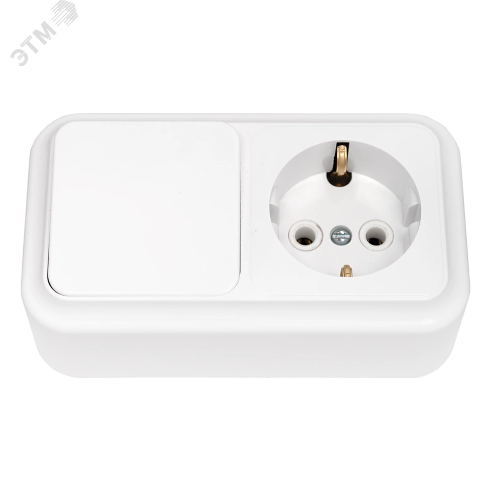Блок состоит из выключателя одноклавишного и розетки с заземляющим контактом открытой установки. Материал корпуса изготовлен из пластика АБС, обеспечивая прочность и долговечность изделия. Степень защиты блока – IP20, что обеспечивает защиту от пыли и посторонних предметов. Возможность горизонтальной и вертикальной установки.