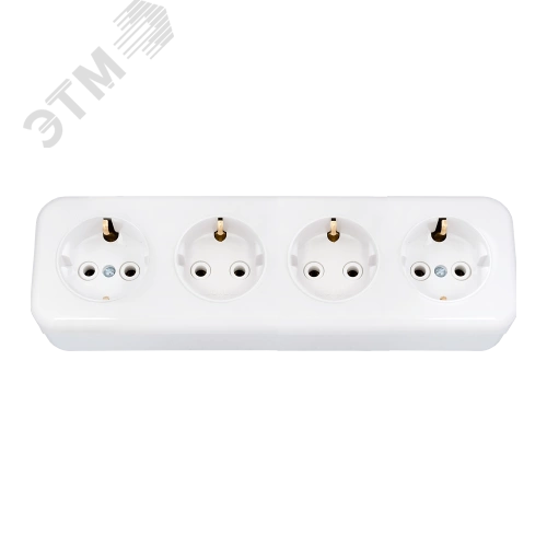 Розетка четырехместная с заземляющим контактом открытой установки, предназначена для присоединения электрических приемников с номинальным напряжением 250 В к электрической сети переменного тока. В качестве материала для производства изделия использовался специальный очень прочный и экологически безопасный полимер. Изделие надёжно защищено от разрушительного воздействия ультрафиолетового излучения, не претерпевает видимых изменений при постоянных многочисленных эксплуатационных контактах. Надёжная контактная группа. Изделие выдерживает 20 А