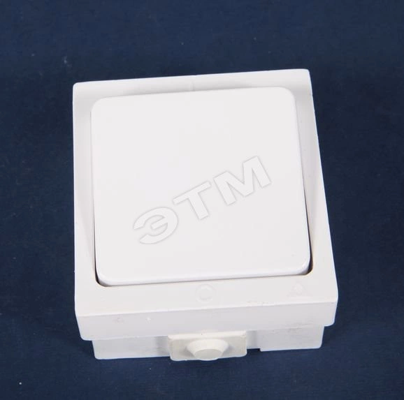 Выключатель одноклавишный брызгозащищенный открытой установки. В качестве материала для производства изделия использовался пластик ABS. Выключатель имеет посеребренные контакты. У выключателя глянцевая поверхность. Он устойчив к УФ-излучению и имеет ударо-прочный и стойкий к излому корпус.