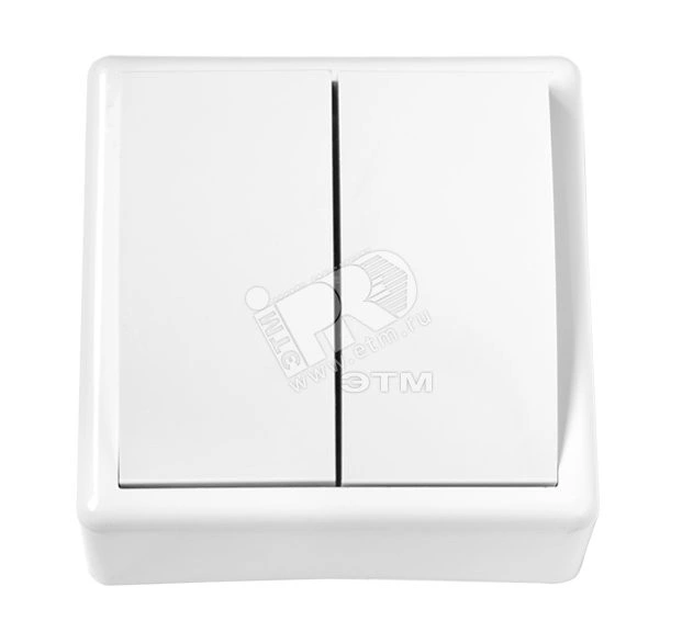 Выключатель установочный двухклавишный однополюсный для открытой установки предназначен для коммутации электрической цепи переменного тока с номинальным напряжением 250 В в нормальных климатических условиях внешней среды по ГОСТ 15150 и ГОСТ 15543.1.