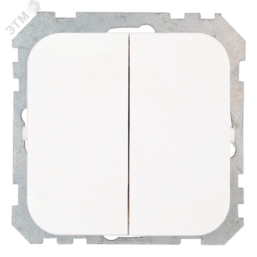 Выключатель двухклавишный скрытой установки (узел). В качестве материала для производства изделия использовался пластик ABS. Выключатель имеет посеребренные контакты. У выключателя глянцевая поверхность. Он устойчив к УФ-излучению и имеет ударо-прочный и стойкий корпус.