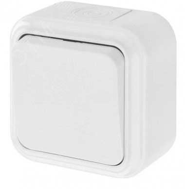 Выключатель одноклавишный брызгозащищенный открытой установки. Выключатель имеет посеребренные контакты. В качестве материала для производства изделия использовался специальный очень прочный и экологически безопасный полимер. Изделие надёжно защищено от разрушительного воздействия ультрафиолетового излучения, не претерпевает видимых изменений при постоянных многочисленных эксплуатационных контактах.