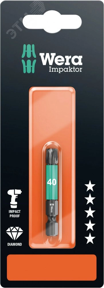 Высококачественные биты TORX. Технология Impaktor обеспечивает срок службы инструментов, заметно превышающий средние показатели даже с учетом жестких условий их применения. Повышенное сопротивление трением за счёт шероховатого покрытия из алмазных частиц предотвращает выскальзывание наконечника из винта. Особенно подходят для работы с предлагаемыми на рынке ударными винтовертами. Шестигранный хвостовик 1/4'', подходит для держателя по стандарту DIN ISO 1173-F 6,3.