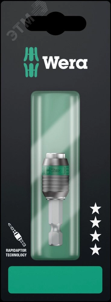 Универсальный держатель Rapidaptor для битов с шестигранным хвостовиком 1/4'' по стандарту DIN ISO 1173-C 6,3 и E 6,3 (ISO 1173). Rapidaptor позволяет ставить биты даже без использования гильзы. Извлечение битов осуществляется простым сдвиганием гильзы вперед - моментальная смена битов даже одной рукой. Сильный постоянный магнит держит биты мертвой хваткой. Наружный шестигранник 1/4'' стержень подходит для использования в шуруповертах с патроном по стандарту DIN ISO 1173-F 6,3.