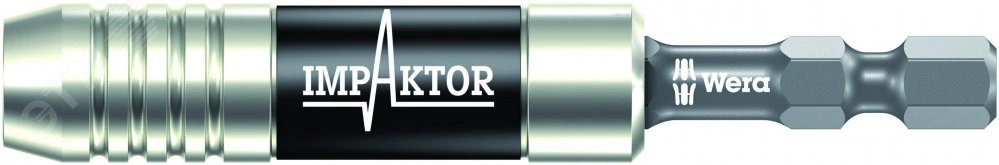 Держатель Impaktor Wera для смягчения максимальных импульсных скачков. Особый эффект за счёт наличия двух разных торсионных зон. Стопорное кольцо гарантирует оптимальную посадку инструмента в держателе. Магнит дополнительно служит плотному контакту бита и винта. Держатели Impaktor из специальной стали со стопорным кольцом и магнитом отвечают самым строгим требованиям по динамическим параметрам, поскольку в них сознательно не используются механически непрочные мелкие детали. Используются преимущественно в промышленном монтаже для завинчиваний, например, с помощью роботов. Отвод - подходит для битов с шестигранным хвостовиком 1/4'' по стандарту DIN ISO 1173-C 6,3. Привод - шестигранный хвостовик 1/4'', подходит для шуруповёртов с патроном по стандарту DIN ISO 1173-F 6,3.