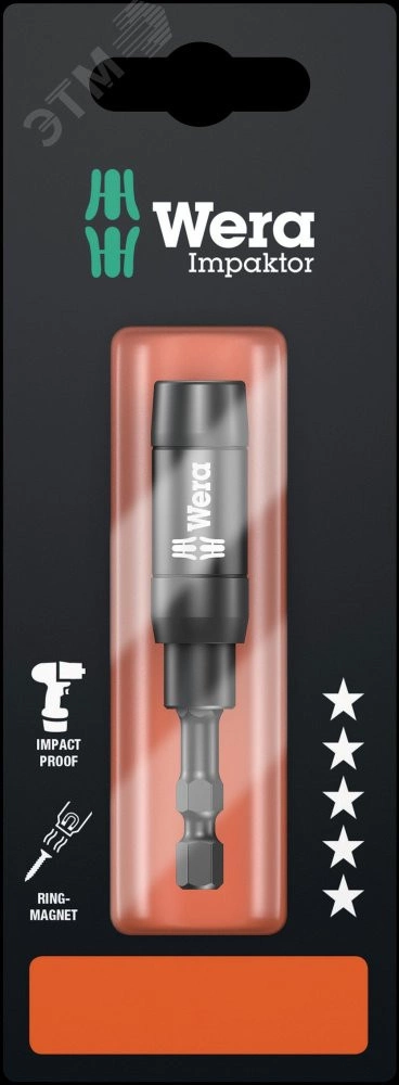 Держатель Impaktor Wera смягчает экстремальные импульсы. Особый торсионный эффект за счёт двойной торсионной зоны. Держатель Impaktor дополнительно держит мертвой хваткой даже длинные и тяжелые винты. Это позволяет быстро и надёжно наживить винт. Он идеально подходит для работы в положении над головой. Если ситуация, например, работа с металлическими деталями делает использование магнита нежелательным, то его можно вывести из рабочей зоны, нейтрализовав таким образом его действие. Эти держатели используются преимущественно для завинчивания в ручном режиме с машинным приводом. Отвод - подходит для битов с шестигранным хвостовиком 1/4'' по стандарту DIN ISO 1173-C 6,3. Привод - шестигранный хвостовик 1/4'', подходит для шуруповертов с патроном по стандарту DIN ISO 1173-F 6,3.