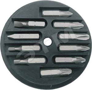 В пластиковом картридже. В наборе - 10 бит из хром-ванадиевой стали длиной 25 мм (SL4.5, SL6.3, PH1, PH2, PH3, PZ1, PZ2, PZ3, T15, T20). Упаковка - блистер.