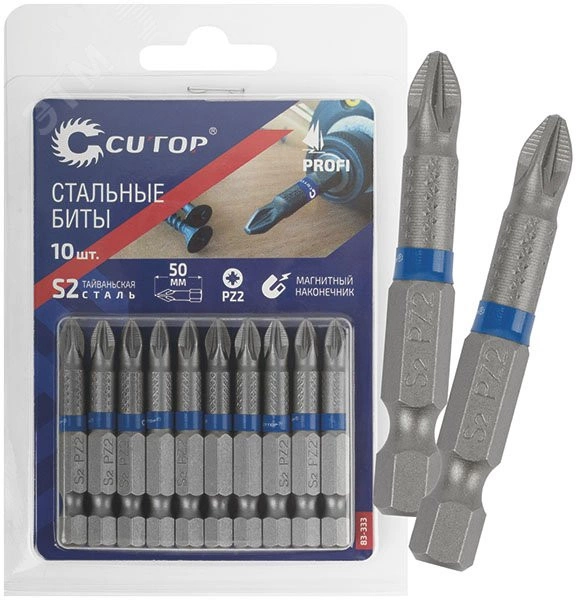 Намагниченный шлиц, антискользящие риски.Высокая точность. Биты изготавливается из тайваньской стали высшего качества марки S2. Знак качества. Ребра биты производятся с помощью холодной штамповки в соответствии с точной спецификацией. Кончик проходит специальный процесс закалки при температурах до 870 градусов по Цельсию. Результатом является насадка с твердостью 60 HRC для увеличения срока службы. Биты произведены по технологии CUTOP. Ресурс биты от 2000 шт. саморезов (собственные испытания, проведенные на саморезах по дереву 3,5х41). Упаковка - картонный подвес.