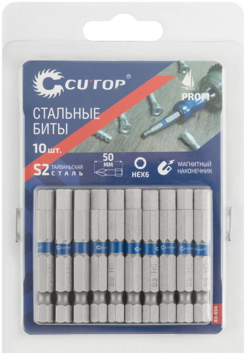 Намагниченный шлиц, антискользящие риски.Высокая точность. Биты изготавливается из тайваньской стали высшего качества марки S2. Знак качества. Ребра биты производятся с помощью холодной штамповки в соответствии с точной спецификацией. Кончик проходит специальный процесс закалки при температурах до 870 градусов по Цельсию. Результатом является насадка с твердостью 60 HRC для увеличения срока службы. Биты произведены по технологии CUTOP. Ресурс биты от 2000 шт. саморезов (собственные испытания, проведенные на саморезах по дереву 3,5х41). Упаковка - картонный подвес.