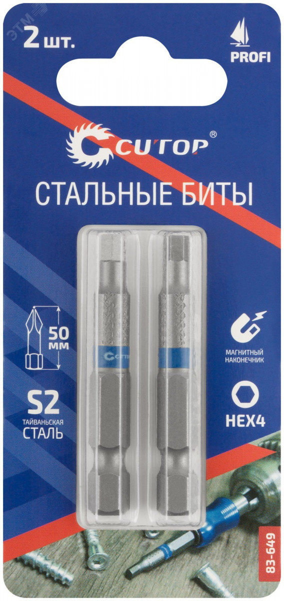 Намагниченный шлиц, антискользящие риски.Высокая точность. Биты изготавливается из тайваньской стали высшего качества марки S2. Знак качества. Ребра биты производятся с помощью холодной штамповки в соответствии с точной спецификацией. Кончик проходит специальный процесс закалки при температурах до 870 градусов по Цельсию. Результатом является насадка с твердостью 60 HRC для увеличения срока службы. Биты произведены по технологии CUTOP. Ресурс биты от 2000 шт. саморезов (собственные испытания, проведенные на саморезах по дереву 3,5х41). Упаковка - картонный подвес.