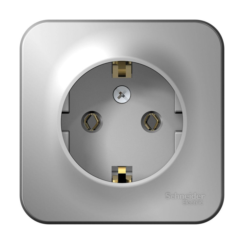 Розетка Systeme Electric (ранее Schneider Electric) BLANCA (алюминий, открытой установки) одноместная с заземлением, без шторок, предназначена для сетей до 250В, на ток до 16А. Заземление обеспечивает безопасность при косвенном прикосновении. Она изготовлена из ABS-пластика, проста в установке и удобна в применении.