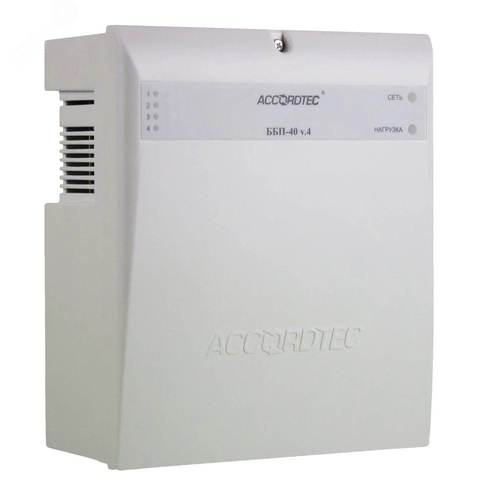 Источник вторичного электропитания AccordTec ББП-40 v.4 исп.1, резервированный. Напряжение питания от сети переменного тока частотой 50 Гц 165...264 В, выходное напряжение постоянного тока 12.6 – 13.6 В, номинальный ток нагрузки 4 А. Рекомендуемый аккумулятор 12 В 7 Ач. Блок бесперебойного питания AccordTec ББП-40 v.4 исп.1 имеет световую индикацию режимов работы, защиту аккумулятора от глубокого разряда. Габаритные размеры бесперебойного блока питания составляют 170x160x77 мм. Модель выполнена в пластиковом корпусе. Её вес равен 560 г.