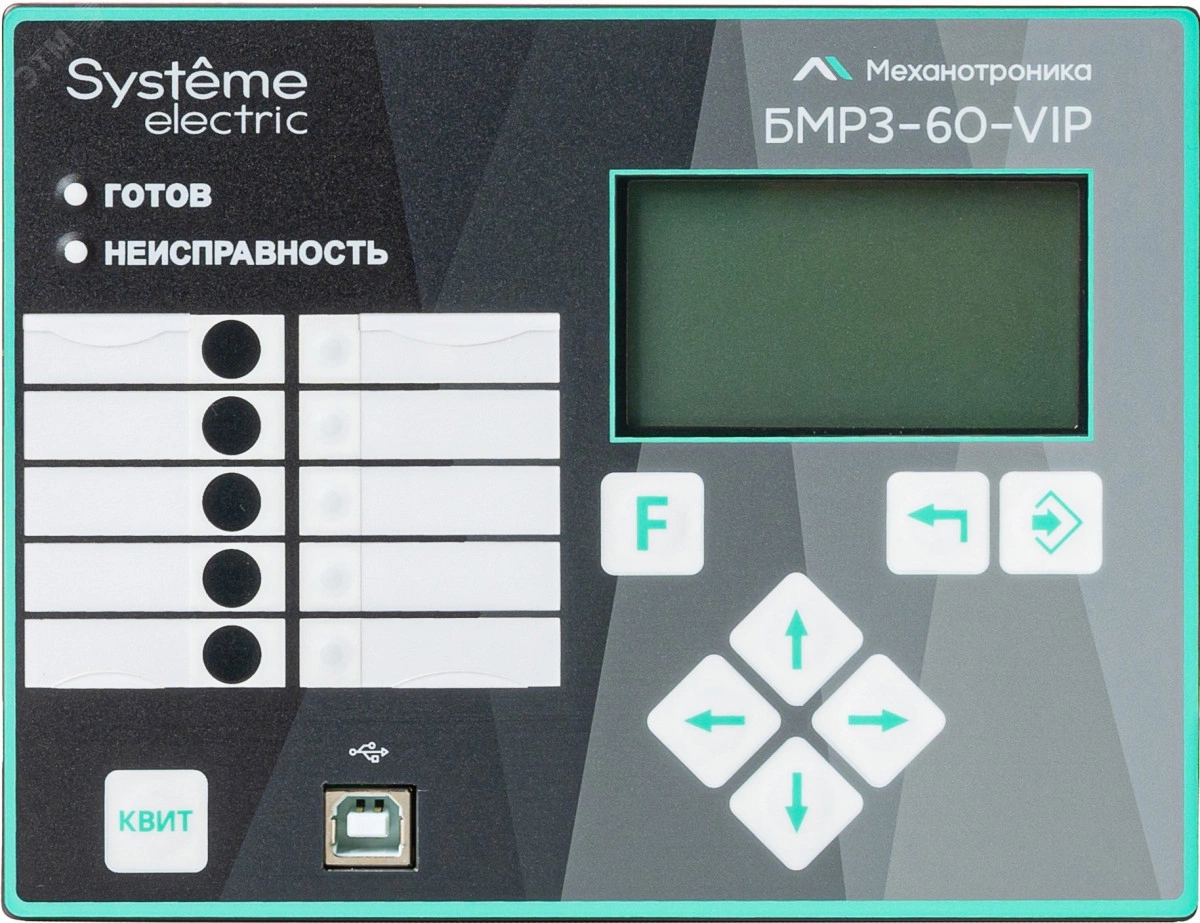 Блок микропроцессорный релейной защиты БМРЗ-60-VIP-1520М0-01 торговой марки НТЦ Механотроника. Без внешнего питания, номинальный ток трансформатора тока (ТТ) &ndash, 5А, дискретные входы 220 В постоянного/переменного тока (универсальные) с импульсом режекции тока, без портов связи, выход управления автоматическим выключателем (АВ) с расцепителем Mitop.