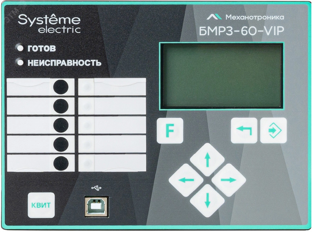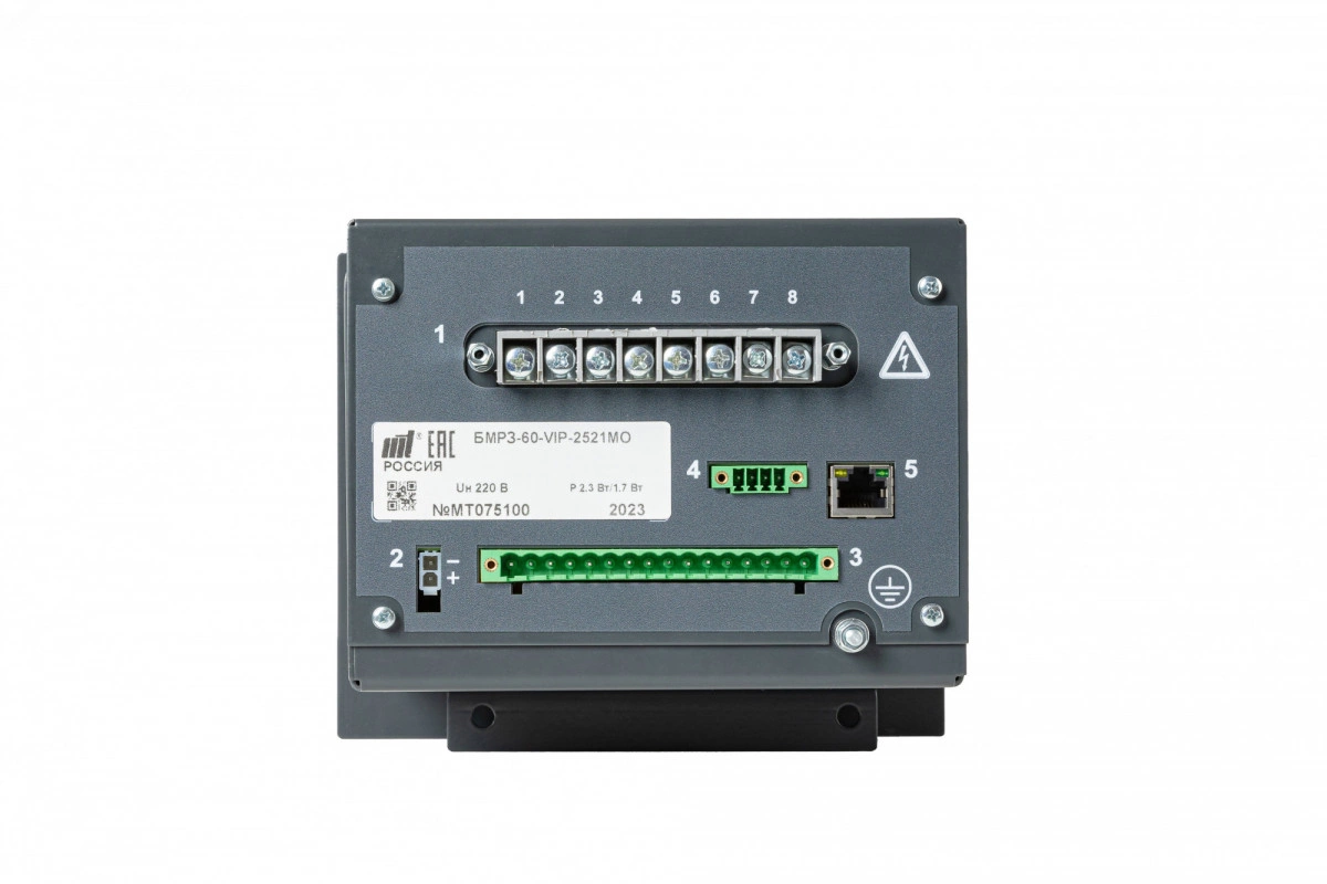 Блок микропроцессорный релейной защиты БМРЗ-60-VIP-2521М0-01 торговой марки НТЦ Механотроника. С внешним питанием Uном - 220В, номинальный ток трансформатора тока (ТТ) &ndash, 5А, дискретные входы 220 В постоянного/переменного тока (универсальные) с импульсом режекции тока, один порт RS-485 и один порт Ethernet 10/100 BASE-TX, выход управления автоматическим выключателем (АВ) с расцепителем Mitop.