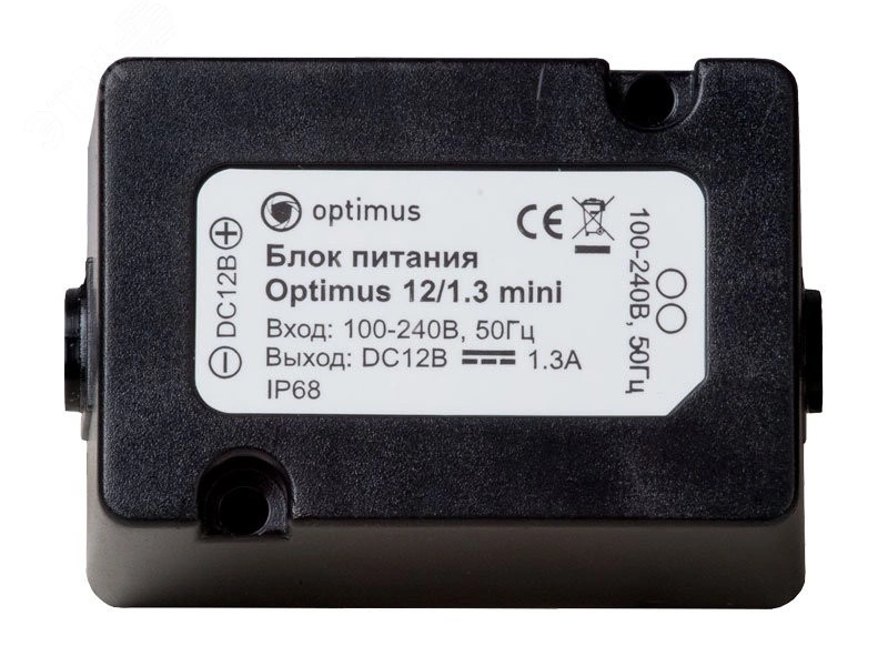 "12В, 1,3А, IP68. Входное напряжение переменное от 160 до 242В, частота 50Гц, постоянное выходное напряжение 12-12,4 В, напряжение пульсаций (от пика до пика) не более 30мВ, номинальный выходной ток не более 1,3А, масса 0,094кг, время наработки на отказ 100 000 часов, класс защиты от поражения эл.током 2. Компактный корпус 56х39х26мм, позволяет установку в любом месте,даже под штукатурку. Рабочая температура от -30 до +40гр. С, IP68. 56х39х26 мм"