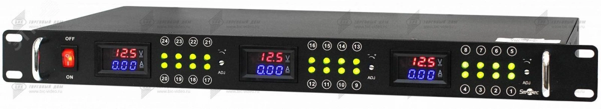 Блок питания в стойку 19-оснащенный 24 выходными каналами, каждый из которых имеет самовосстанавливающиеся предохранители для обеспечения индивидуальной защиты.