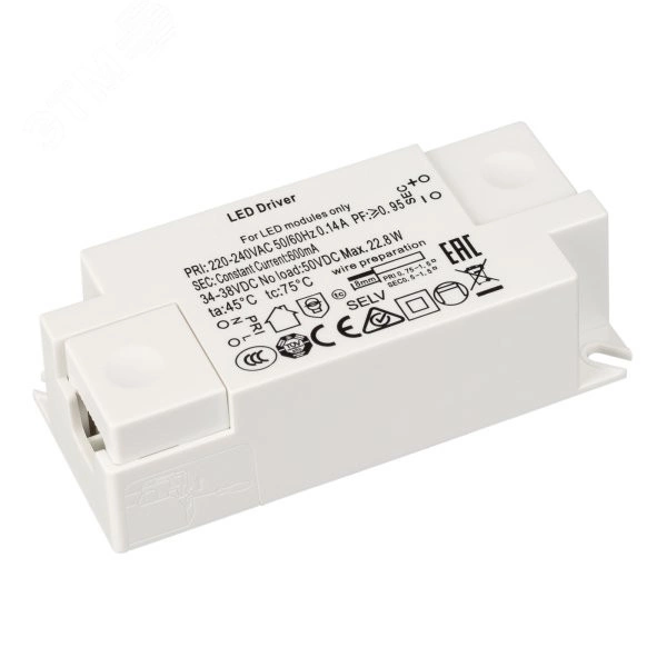 Поставка под заказ от 650 шт. Источник тока с гальванической развязкой для светильников с COB-матрицей. Входное напряжение 220-240 VAC. Выходные параметры - 34-38 В, 600 mА, 23 Вт. Встроенный PFC >0,92. Негерметичный пластиковый корпус IP 20. Габаритные размеры длина 88 мм, ширина 40 мм, высота 25 мм. Гарантийный срок 3 года.