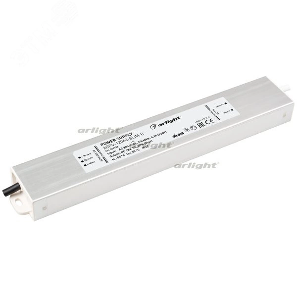Поставка под заказ от 520 шт. Источник напряжения с гальванической развязкой для светодиодных изделий. Входное напряжение 200-240 VAC. Выходные параметры - 12 В, 5 А, 60 Вт. Встроенный PFC >0,5. Герметичный алюминиевый корпус IP 67. Рабочая температура -25…плюс50C. Габаритные размеры длина 253 мм, ширина 40 мм, высота 23.5 мм. Гарантийный срок 3 года.