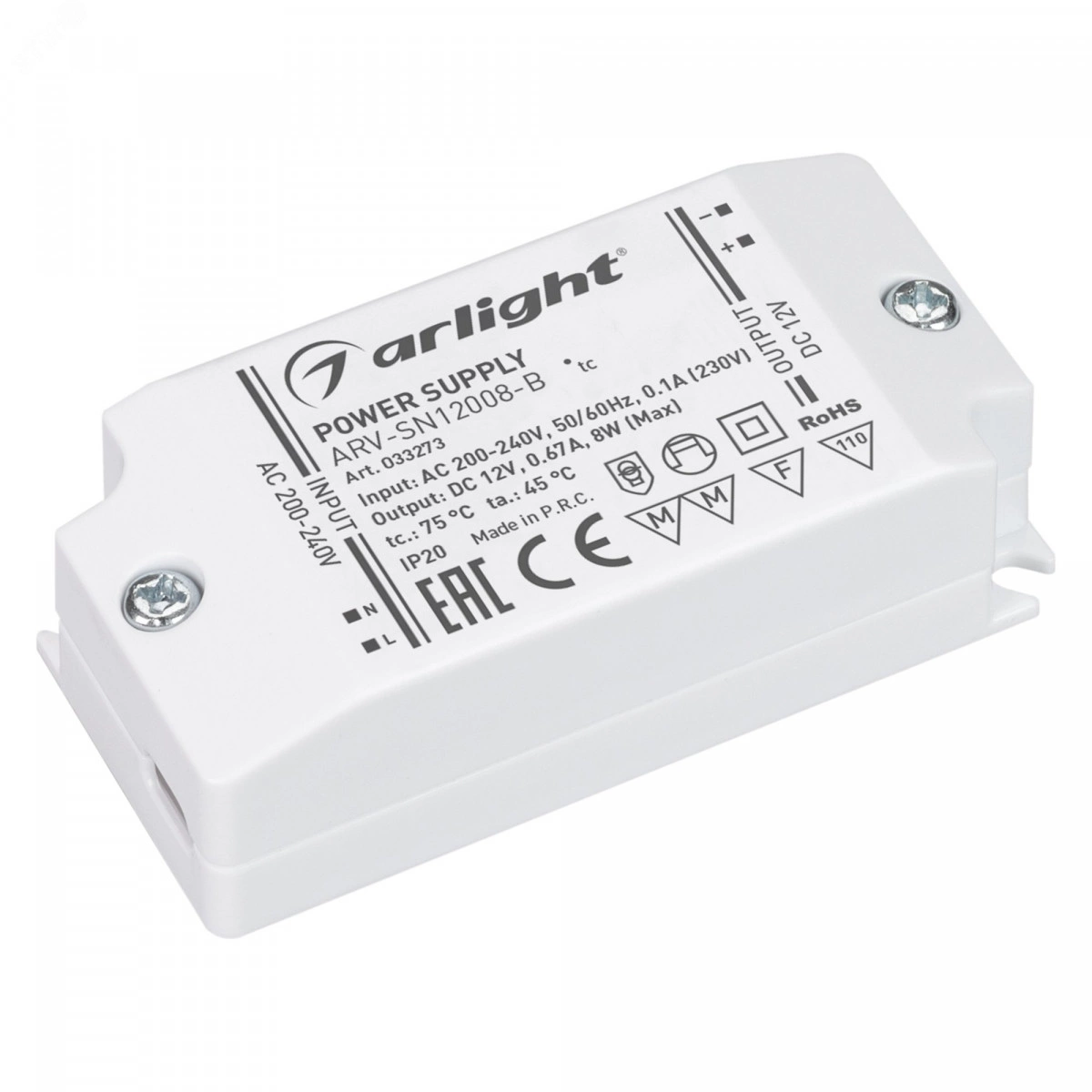 Блок питания ARV-SN12008-B (12V, 0.67A, 8W) (, IP20 Пластик, 3 года)