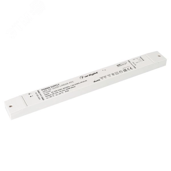 Источник напряжения с гальванической развязкой для светодиодных изделий. Входное напряжение 220-240 VAC. Выходные параметры - 24 В, 10.42 А, 250 Вт. Встроенный PFC >0.9. Тонкий пластиковый корпус IP 20. Габаритные размеры длина 400 мм, ширина 40 мм, высота 22 мм. Гарантийный срок 5 лет.
