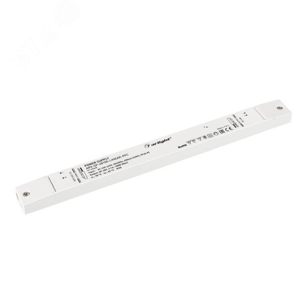 Источник напряжения с гальванической развязкой для светодиодных изделий. Входное напряжение 220-240 VAC. Выходные параметры - 48 В, 2.1 А, 100 Вт. Встроенный PFC >0,9. Негерметичный пластиковый корпус IP 20. Габаритные размеры длина 350 мм, ширина 30 мм, высота 18 мм. Гарантийный срок 5 лет.