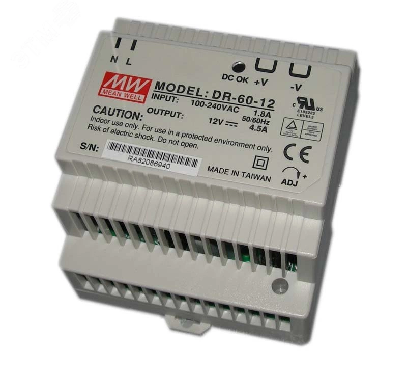 Имеет выходное постоянное напряжение 12 В при токе нагрузки до 4,5 А. Рабочий диапазон входного напряжения 88-264 В. Блок питания имеет встроенный комплекс защит от короткого замыкания, перегрузки и перенапряжения. Блок питания выполнен в пластмассовом корпусе серого цвета, предназначенном для монтажа на DIN-рейку.