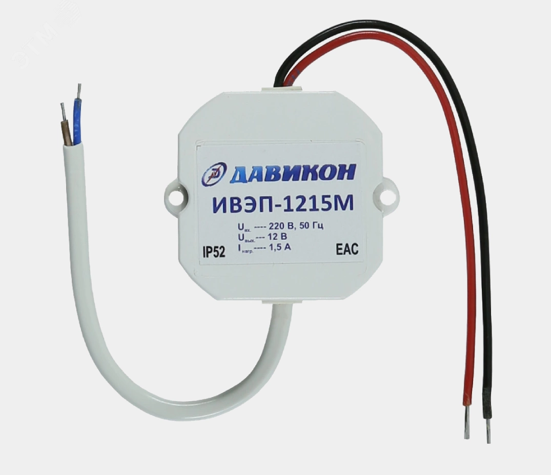 ИВЭП-1215M - это источник стабилизированного питания стабилизированный. Используется с целью устойчивого эксплуатирования приборов, которые работают от сети переменного напряжения 220В. Прибор оснащен электронной защитой от перенапряжения. Конструктивно ИВЭП-1215M выполнен в пластиковом цельном корпусе с защитой от пробоя ''вход-выход'' 4000В, а степень защиты IP 52 подразумевает полную защиту от контакта. Модель может эксплуатироваться при контакте с нестабильной сетью переменного тока, т.к. выдерживает обширный диапазон входных нагрузок - от 100 до 242 В. Подключается в сеть прибор сетевым шнуром с двумя проводами. На выходе ИВЭП-1215M находятся 2 провода - красный, для подключения полюса +12В нагрузки, и синий, для подключения полюса GND нагрузки.
