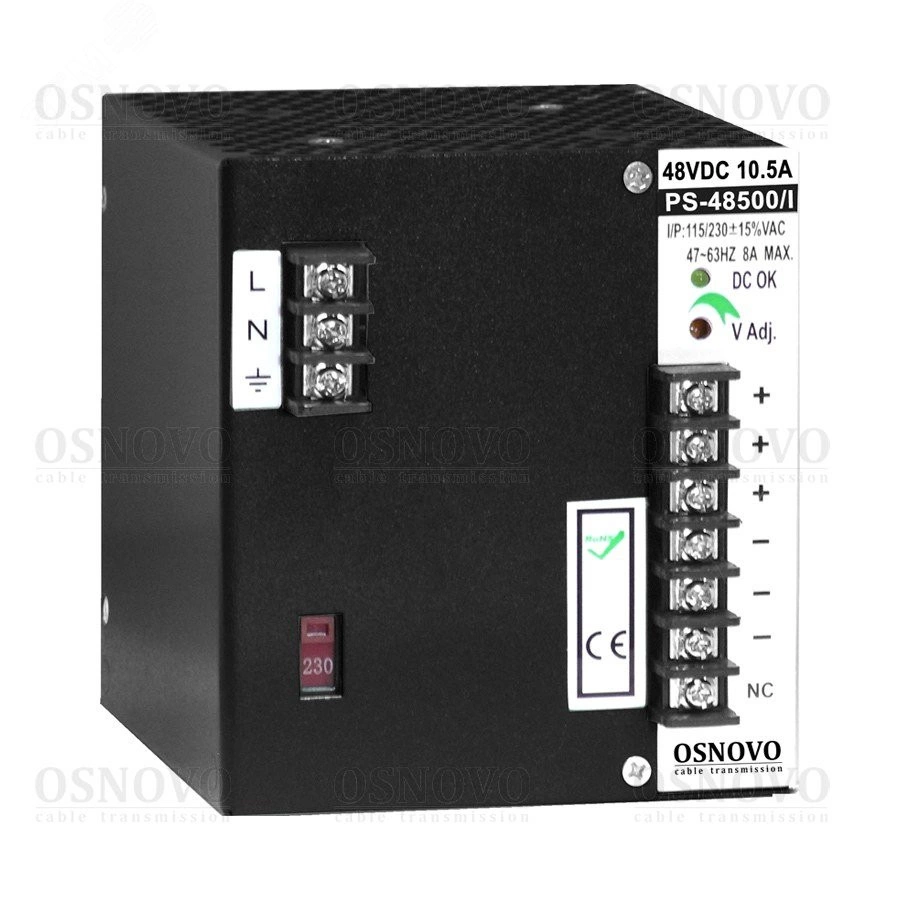 PS-48500/I Промышленный блок питания. DC48V, 10,5A (500W). Диапазон входных напряжений - AC195-265V. КПД - 85%. Регулировка выходного напряжения в диапазоне 44-53V. Защита от короткого замыкания, перенапряжения и перегрузки. Принудительная система охлаждения (вентилятор). Монтаж на DIN-рейку или стену. Размеры (ШxВxГ) - 100x110x121мм. Рабочая температура -40...+50°C.