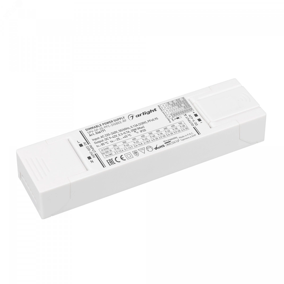 Блок питания SPV-SP-20-PFC-ZIGBEE-RF (20W, 9-42V, 0.3-0.7A, 2.4GHz) (Arlight, IP20 Пластик, 5 лет)