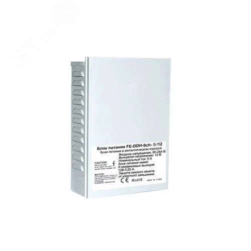 Блок питания в металлическом корпусе . Входное напряжение 90-264V Выходное 12V Номинальный ток 5A. Блок питания имеет 9 независимых выходов 12V 055A защика каждого канала от короткого замыкания.