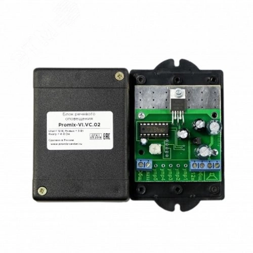Блок речевого оповещения Promix-VI.VC.02 - предназначен для воспроизведения голосовых сообщений о действиях системы ограничения доступа в зону самообслуживания банкомата Promix-Bank на базе контроллера Promix-CS.PD.01 (версии 2.Х). Напряжение питания-+12,0 В+10% / -15%.