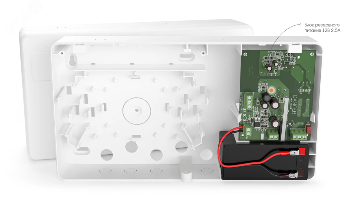 Блок резервного питания 12В 2.5А в корпусе под АКБ 1.2 Ач (далее — источник питания) предназначен для питания устройств компании Ритм постоянным напряжением 14 В с максимальным током нагрузки 2.5 А. При подключении к контрольной панели увеличивает количество вводов электропитания - источник питания работает от сети переменного напряжения 230 В (основное питание) и постоянного напряжения 12 В (резервное питание). В качестве резервного питания может использоваться свинцовая аккумуляторная батарея.