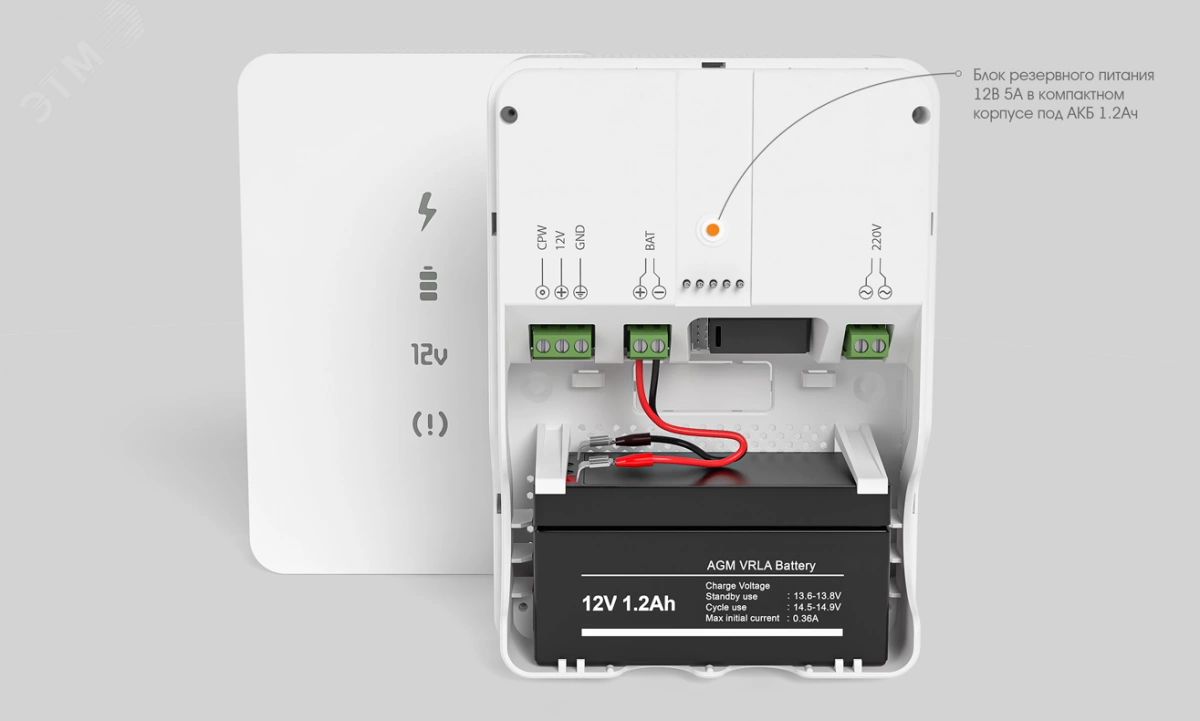 Блок резервного питания 12В 5А в корпусе ''Контакт'' под АКБ 1,2 Ач (далее — источник питания) предназначен для питания устройств компании ''Ритм'' постоянным напряжением 14 В с максимальным током нагрузки 4.5 А. При подключении к контрольной панели увеличивает количество вводов электропитания - источник питания работает от сети переменного напряжения 230 В (основное питание) и постоянного напряжения 12 В (резервное питание). В качестве резервного питания может использоваться свинцовая аккумуляторная батарея. Источник питания осуществляет автоматическое переключение электропитания с основного ввода на резервный при пропадании напряжения на основном вводе,и обратно. Источник питания производит подзарядку аккумуляторной батареи, используемой в качестве резервного источника питания.