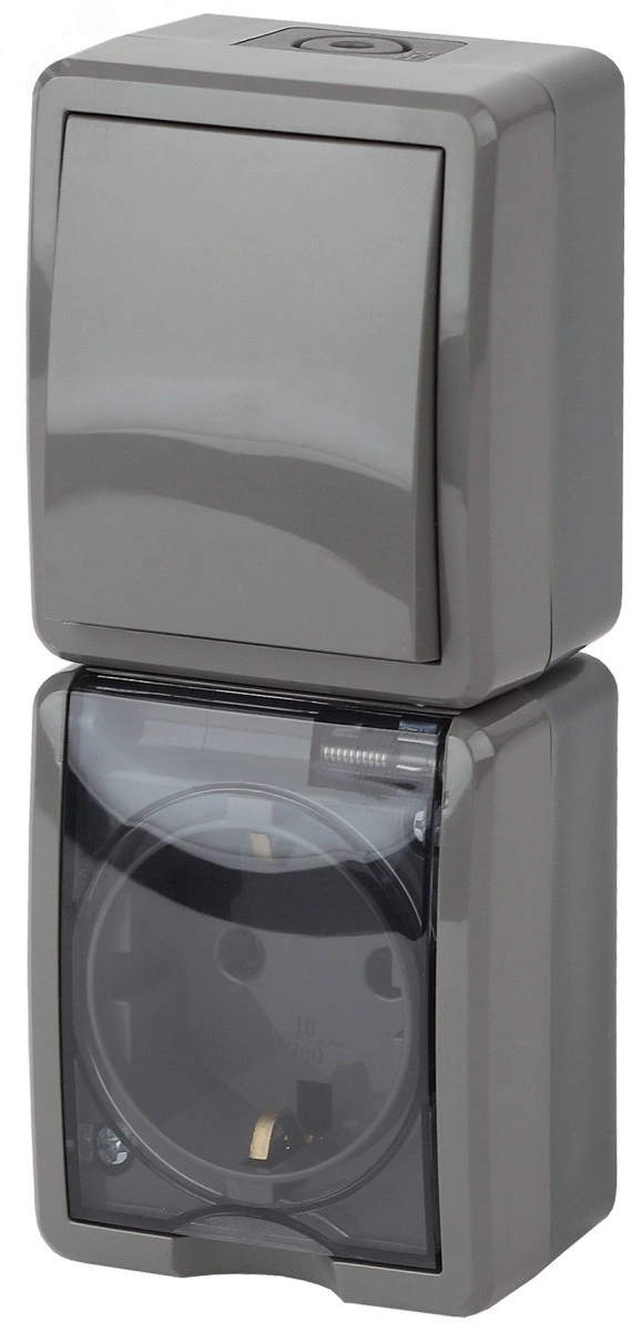 Блок розетка+выкл. верт. IP54, 16A(10AX)-250В, ОУ, Эра Эксперт, серый, 11-7407-03