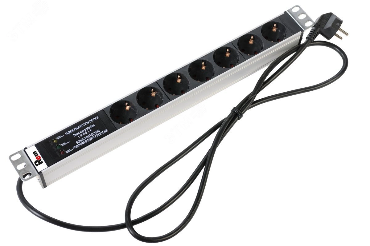 Блок силовых розеток имеет семь портов стандарта Schuko, выполнен в анодированном алюминиевом корпусе. Розетки расположены под углом 45%, для удобного подсоединения коленчатых штекеров. Блок имеет фильтр защиты, на лицевой части блока установлен индикатор питания. Кабель питания 3 метра. Совместим со всеми линейками 19' монтажного оборудования. Поставляется в индивидуальной упаковке с комплектом крепежа. Выполнен в системе несущих конструкций 482,6 мм по ГОСТ 28601.2 (19-дюймовые конструктивы по МЭК 297).
