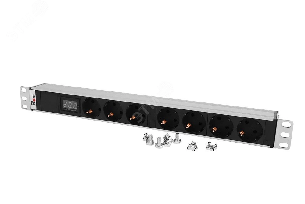 Блок силовых розеток имеет семь портов стандарта Schuko, выполнен в анодированном алюминиевом корпусе. Розетки расположены горизонтально, для удобного подсоединения коленчатых штекеров. На лицевой части блока установлен амперметр. Вход кабеля питания - клемная колодка. Кабель питания в комплект поставки не входит. Совместим со всеми линейками 19' монтажного оборудования. Поставляется в индивидуальной упаковке с комплектом крепежа. Выполнен в системе несущих конструкций 482,6 мм по ГОСТ 28601.2 (19-дюймовые конструктивы по МЭК 297).