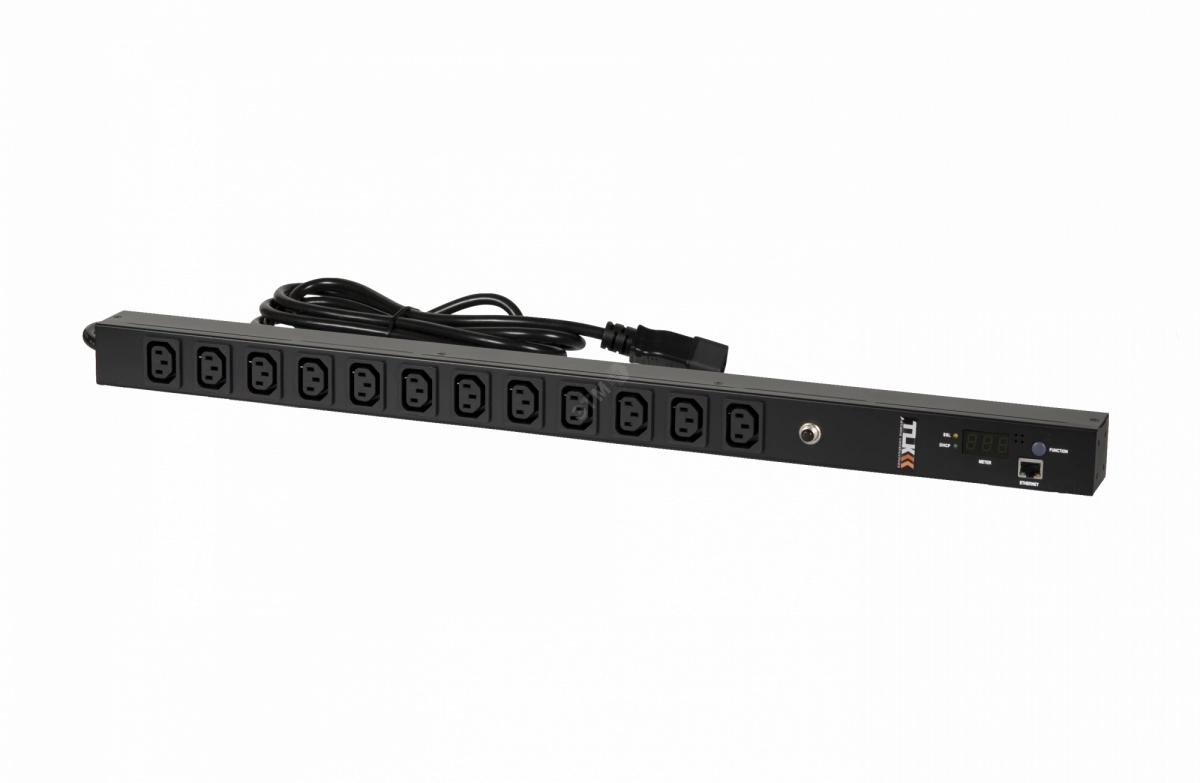 Блок розеток TLK Серия MN (Monitored) вертикальный 12 розеток C13 макс. нагрузка 16 А шнур питания 3 м. вилка С20 цифровое измерение силы тока на входе металлический корпус макс. мощность 4000 Вт 592*44*90 мм цвет черный.