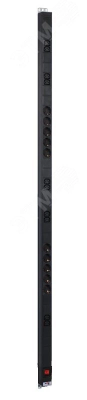 Блок силовых розеток имеет десять портов стандарта Schuko и десять портов стандарта IEC 60320 C19, выполнен в анодированном алюминиевом корпусе. Розетки расположены под углом 45%, для удобного подсоединения коленчатых штекеров. На лицевой части блока установлен выключатель. Блок предназначен для установки в шкафы 33-48U. Поставляется в индивидуальной упаковке с комплектом крепежа.