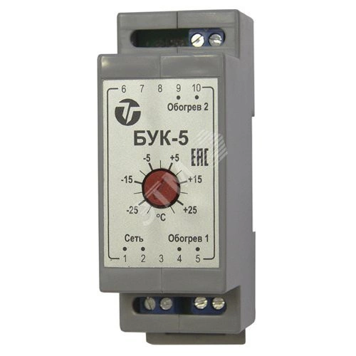 Блок управления климатом БУК-5 предназначен для управления обогревателями (до двух) при заданных значениях температуры внутри шкафа. Конструктивно БУК-5 выполнен в пластмассовом корпусе с креплением на 35мм DIN-рейку.