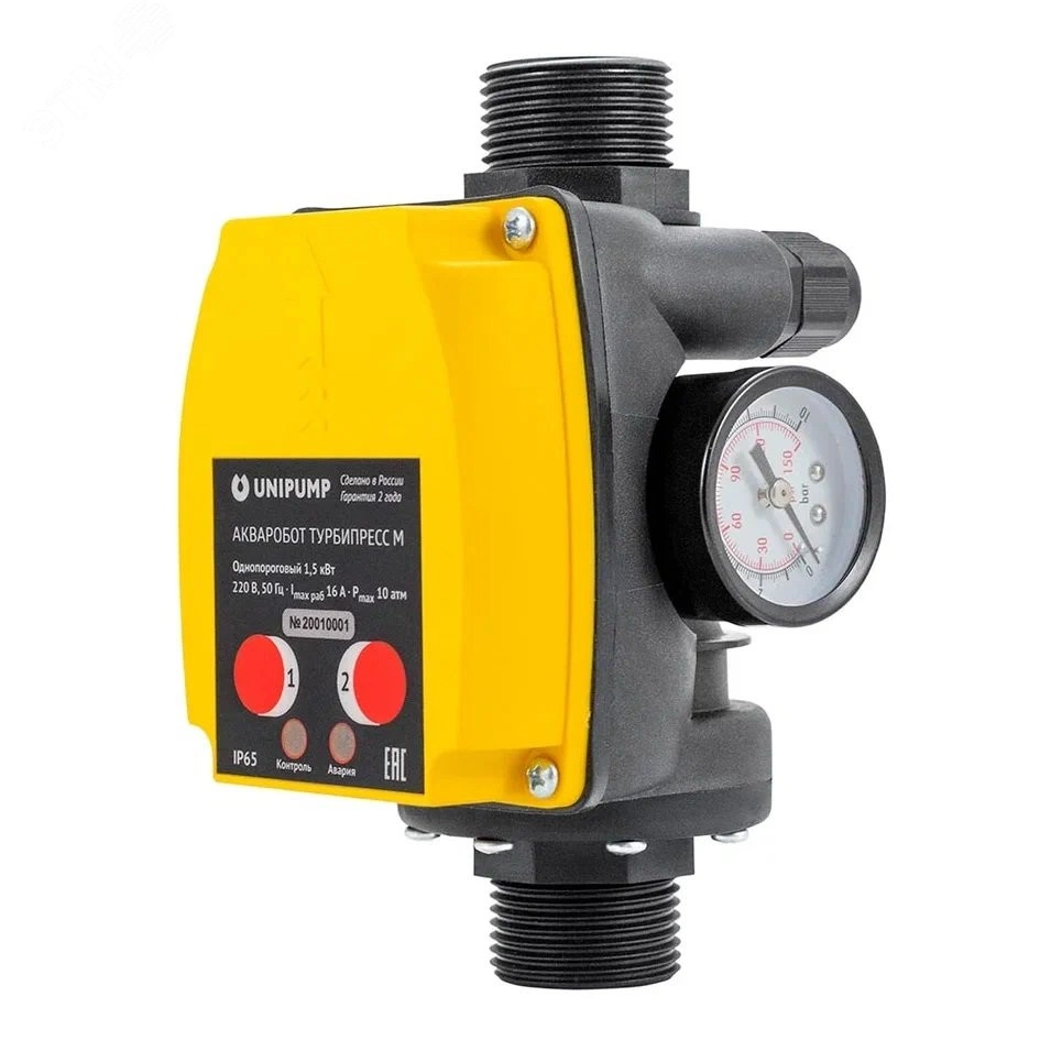 Блок автоматического управления насосом АКВАРОБОТ ТУРБИПРЕСС М2 предназначен для автоматического управления однофазными насосами мощностью до 1,5 кВт по потоку жидкости и по давлению в системе.