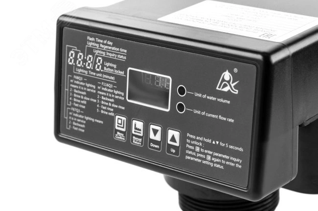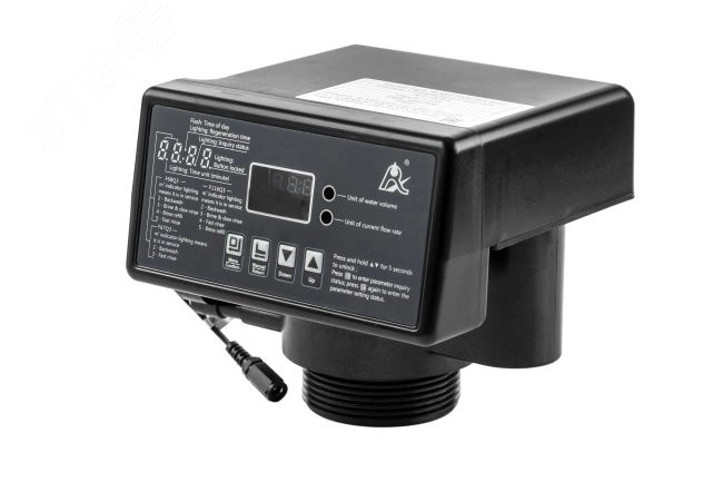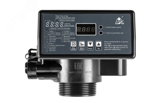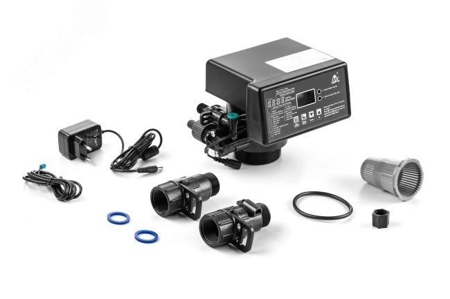 Блок управления автоматический по объему отфильтрованной воды реагентный для умягчителей. Предназначен для коммутации потоков воды внутри корпуса фильтра с зернистой загрузкой. Вход/выход - G1, дренаж - NPT3/4, солевая линия - G3/8, посадочный размер - 2,5''-8NPSM, диаметр трубы ДРС - 1,05''OD, максимальная производительность, м3/ч - 5, размер корпуса фильтра - 6-18'', протестирован на рабочее давление - 2-6 атм, рабочая температура - 4-38 градусов Цельсия, совместимость с загрузками - умягчающие, анионообменные и катионообменные смолы, все виды загрузок ''Экотар'', примечание - DF.