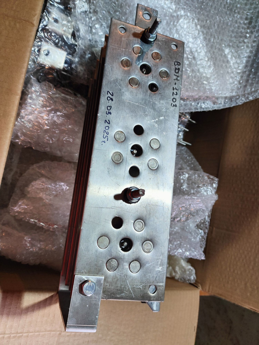 Блок выпрямительный к ВДМ-1203 собран на диодах без применения тиристоров, запрессованными в пластины радиатора для эффективного охлаждения выпрямительной сборки толщиной до 3мм. Диоды соединены группами в трёхфазную кольцевую схему. Такой способ позволяет применять диоды малой мощности, не требующие громоздких радиаторов охлаждения. В целом, конструкция позволяет снизить себестоимость детали, при этом имея достаточный запас по току в данном габарите. На некоторых выпрямительных блоках ставится по два блока тем самым достигая большего тока при необходимости в зависимости от аппарата на котором вышел из строя данный диодный мост (выпрямительный блок).