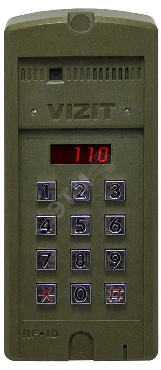 Блок вызова Vizit БВД-SМ110FСР, используемый в составе многоквартирных видеодомофонов VIZIТ. Обеспечивает двухстороннюю связь между посетителем и абонентом, визуальный контроль обстановки перед блоком вызова, а также открывание замка двери подъезда - из квартиры в режиме разговора нажатием кнопки на абонентском устройстве, ключами VIZIТ-RF снаружи подъезда, нажатием кнопки ЕХIТ изнутри подъезда. Для питания блока вызова и замка рекомендуется применять блок питания БПД18/12-1-1.