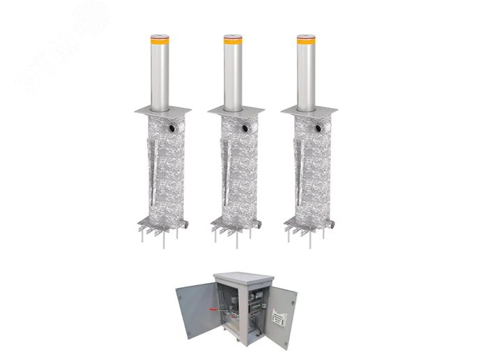Блокиратор автоматический выдвижной серии TBD Traffic Regulation. В комплекте 3 болларда, шкаф управления с рукавом высокого давления 10 метров, межблочными рукавами 1,2 метра, клапаном аварийного опускания преграды и кнопочной станцией (HPU-EBTN). Столбы оборудованы зуммером, светодиодной индикацией и рубашкой из нержавеющей стали.