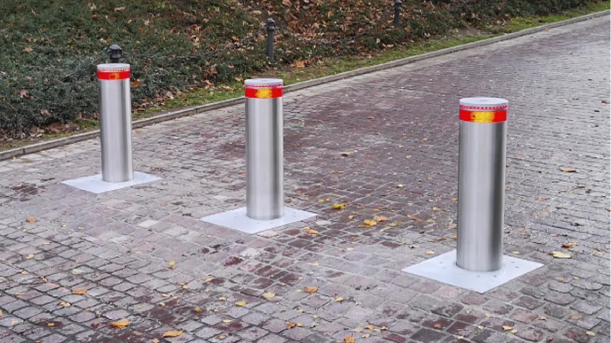 Блокиратор стационарный серии TBD Traffic Regulation. Столб оборудован светоотражающей полосой и рубашкой из нержавеющей стали.