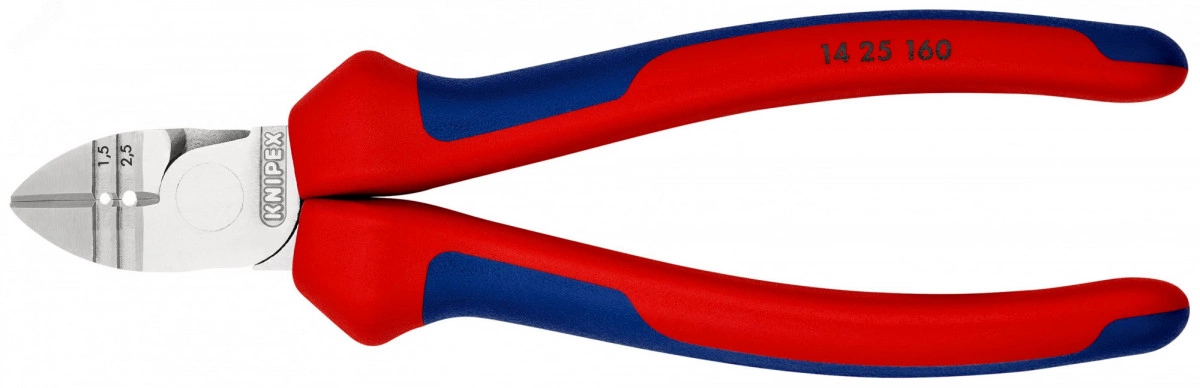14 25 160 Бокорезы для удаления изоляции с длинным лезвием. высокая режущая способность благодаря усиленному шарниру. прецизионные отверстия для зачистки проводов 1,5 и 2,5 мм?. удобное резание кабеля NYM до 5 x 2,5 мм?. вытянутая форма для тонкой резки материалов даже в стесненных условиях. Pежущие кромки с индуктивной закалкой, твердость лезвия прим. 60 HRC. - Параметры резания/ мягкая проволока (диаметр) - 2,5mm - Параметры резания/проволока средней твёрдости (диаметр) - 1,5mm - Параметры удаления изоляции кв.мм - 1,5/ 2,5mm? - AWG - 16/ 14