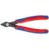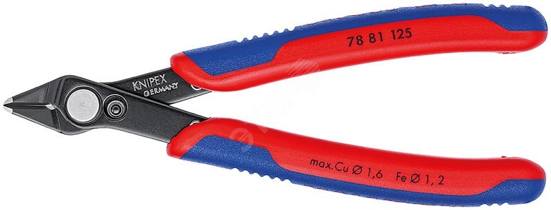 Electronic Super Knips кусачки прецизионные для самых тонких работ по резанию, например, в электронике и точной механике. шлифованные, очень острые режущие кромки без фасок. Прецизионные кончики режут заподлицо проволоку диаметром от 0,2 мм. Рез с контролируемым смещением режущей кромки - для увеличениясрока службы и высокоточной резки самых тонких проводов. шарнир с заклепкой из легированной стали. исключительно легкий ход для работы с минимальным утомлением. с раскрывающей пружиной и ограничителем раскрытия. прецизионно шлифованные режущие кромки с очень маленькой фаской в т.ч. для твердой проволки. режущие кромки дополнительно закалены токами высокой частоты до твердости примерно 64 HRC. cталь инструментальная специальная, вороненая